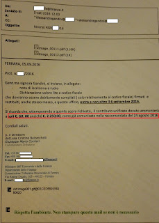 Più sotto, pubblico una mail ricevuta da un collaboratore della "tributaria" di Roma, a seguito di un mio Ricorso effettuato contro il Consorzio Bonifica di Ferrara. In questa mail si può evidenziare che, a fronte di una richiesta di denaro di € 60, se non pagherò, mi verrà richiesta una somma di € 2.250 !