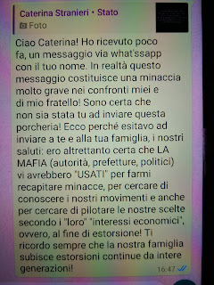 Ciao Caterina! Ho ricevuto poco fa, un messaggio via WhatsApp con il tuo nome. In realtà questo messaggio costituisce una minaccia molto grave nei confronti miei e di mio fratello! Sono certa che non sia stata tu ad inviare questa porcheria! Ecco perché esitavo ad inviare a te e alla tua famiglia, i nostri saluti: ero altrettanto certa che LA MAFIA (autorità, prefetture, politici) vi avrebbe "USATI" per farmi recapitare minacce, per cercare di conoscere i nostri movimenti e anche per cercare di pilotare le nostre scelte secondo i "loro" "interessi economici", ovvero, al fine di estorsione!